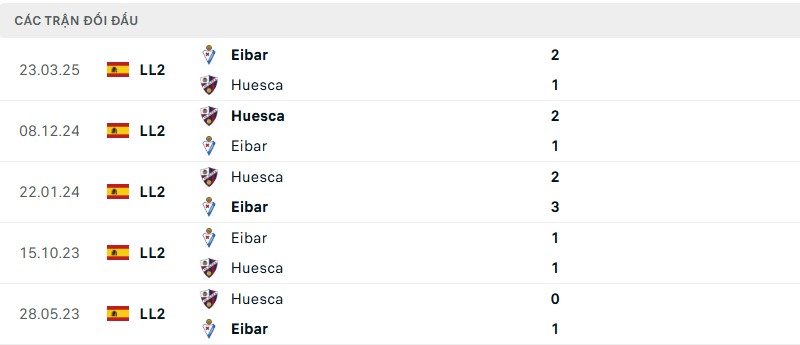 Đáng chú ý, Huesca lại chơi tốt hơn Eibar trong 6 lần gặp nhau gần nhất, với 4 chiến thắng. Điều này chứng minh rằng Huesca không phải đối thủ dễ bị khuất phục. Tuy nhiên, Eibar lại có thành tích làm khách ấn tượng tại sân El Alcoraz, thắng 3 trong 5 lần gần nhất.