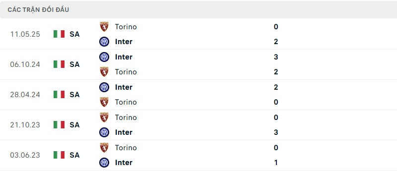 Thành tích khi hai đội chạm trán Inter vs Torino