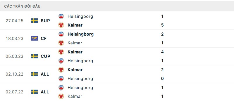 Trong lịch sử 42 lần chạm trán, Kalmar có lợi thế với 17 chiến thắng so với 13 của Helsingborg. Hai đội hòa 12 trận. Kalmar cũng nhỉnh hơn về số bàn thắng 64 so với 61 của Helsingborg. Điều này cho thấy các trận đấu giữa họ luôn diễn ra cân bằng và kịch tính, phản ánh sự cạnh tranh giữa hai đội.