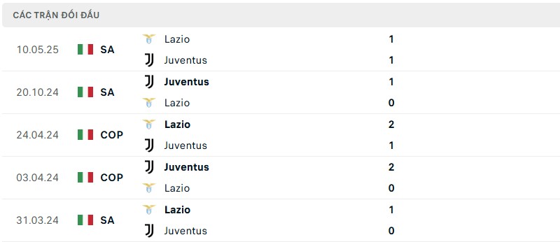 Trong lịch sử đối đầu giữa Lazio và Juventus, ưu thế nghiêng nhẹ về “Bà đầm già thành Turin”. Trong 5 lần chạm trán gần nhất, Juventus thắng 2, Lazio thắng 2 và hai đội hòa nhau 1 trận. Ở lần gặp gần nhất, diễn ra hồi tháng 4/2025, hai đội hòa 1-1 trong thế trận cực kỳ hấp dẫn.