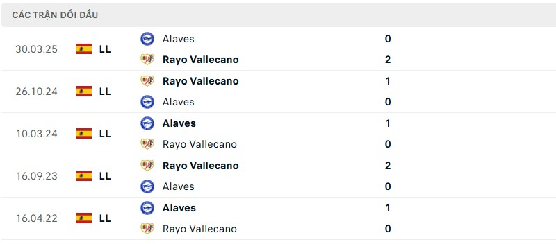 Lịch sử đối đầu giữa Rayo Vallecano và Alaves cũng cho thấy sự cân bằng đáng kể. Trong 5 lần chạm trán gần nhất, Rayo thắng 3 và thua 2. Lần gặp nhau gần nhất giữa hai đội diễn ra vào tháng 3/2025 trong khuôn khổ vòng 29 La Liga mùa trước.