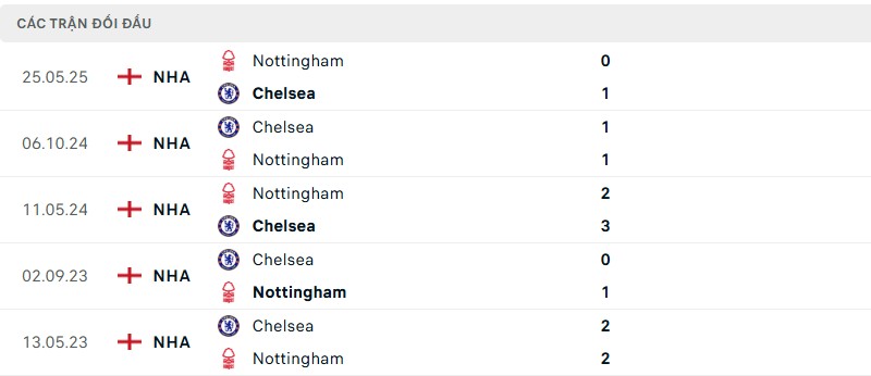 Thành tích đối đầu giữa Nottingham vs Chelsea